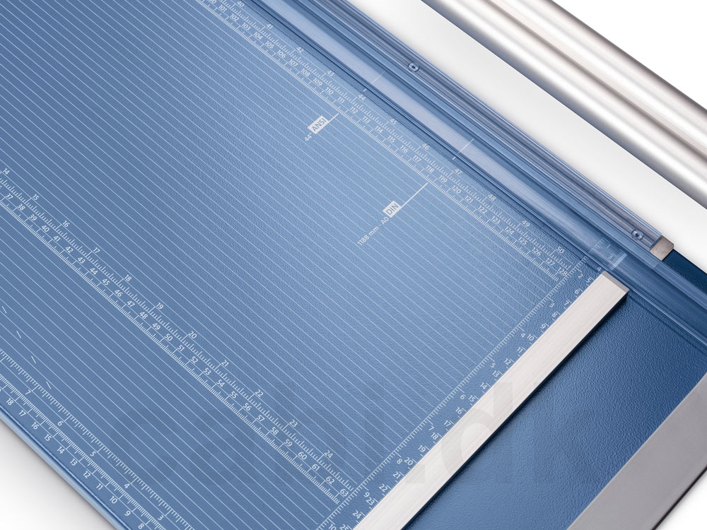 Professionel rulle skæremaskine til skæring af papir og andre materialer. Skærelængde: 1300 mm. Skærehøjde 0,7 mm. Ny forbedret version med bl.a. forbedret skærehoved og dobbelt anlægskant, som er langt mere præcis end tidligere versioner.